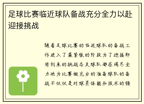 随着足球比赛的临近,球队的备战工作进入了最紧张的阶段。为了迎接即将到来的挑战,各支球队都在竭尽全力地为比赛做充分的准备。球队的备战不仅仅是对球员体能和技术的锤炼,还包括战术的演练、心理素质的提升以及伤...