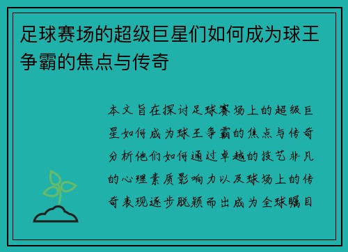 本文旨在探讨足球赛场上的超级巨星如何成为球王争霸的焦点与传奇,分析他们如何通过卓越的技艺、非凡的心理素质、影响力以及球场上的传奇表现,逐步脱颖而出,成为全球瞩目的焦点。文章从四个方面进行了深入分析:首...