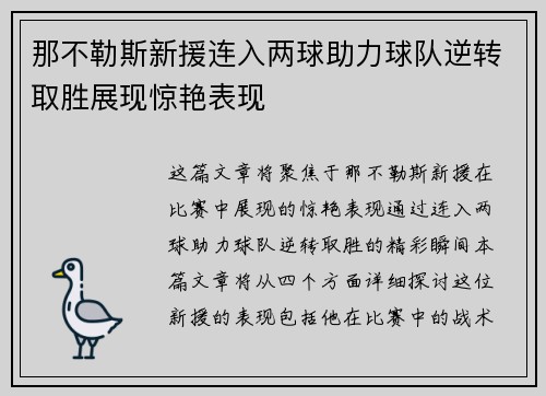 这篇文章将聚焦于那不勒斯新援在比赛中展现的惊艳表现,通过连入两球助力球队逆转取胜的精彩瞬间。本篇文章将从四个方面详细探讨这位新援的表现,包括他在比赛中的战术作用、个人能力的发挥、对球队气氛的影响以及对...