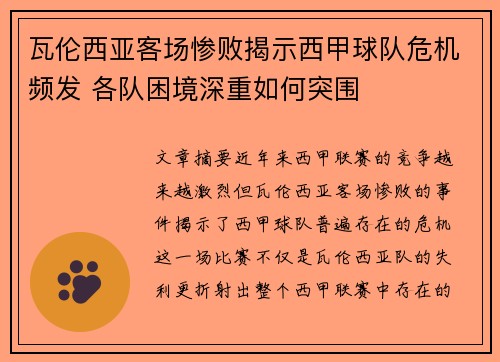 文章摘要:近年来,西甲联赛的竞争越来越激烈,但瓦伦西亚客场惨败的事件揭示了西甲球队普遍存在的危机。这一场比赛不仅是瓦伦西亚队的失利,更折射出整个西甲联赛中存在的多重困境。球队管理层的更替频繁、财政压力...